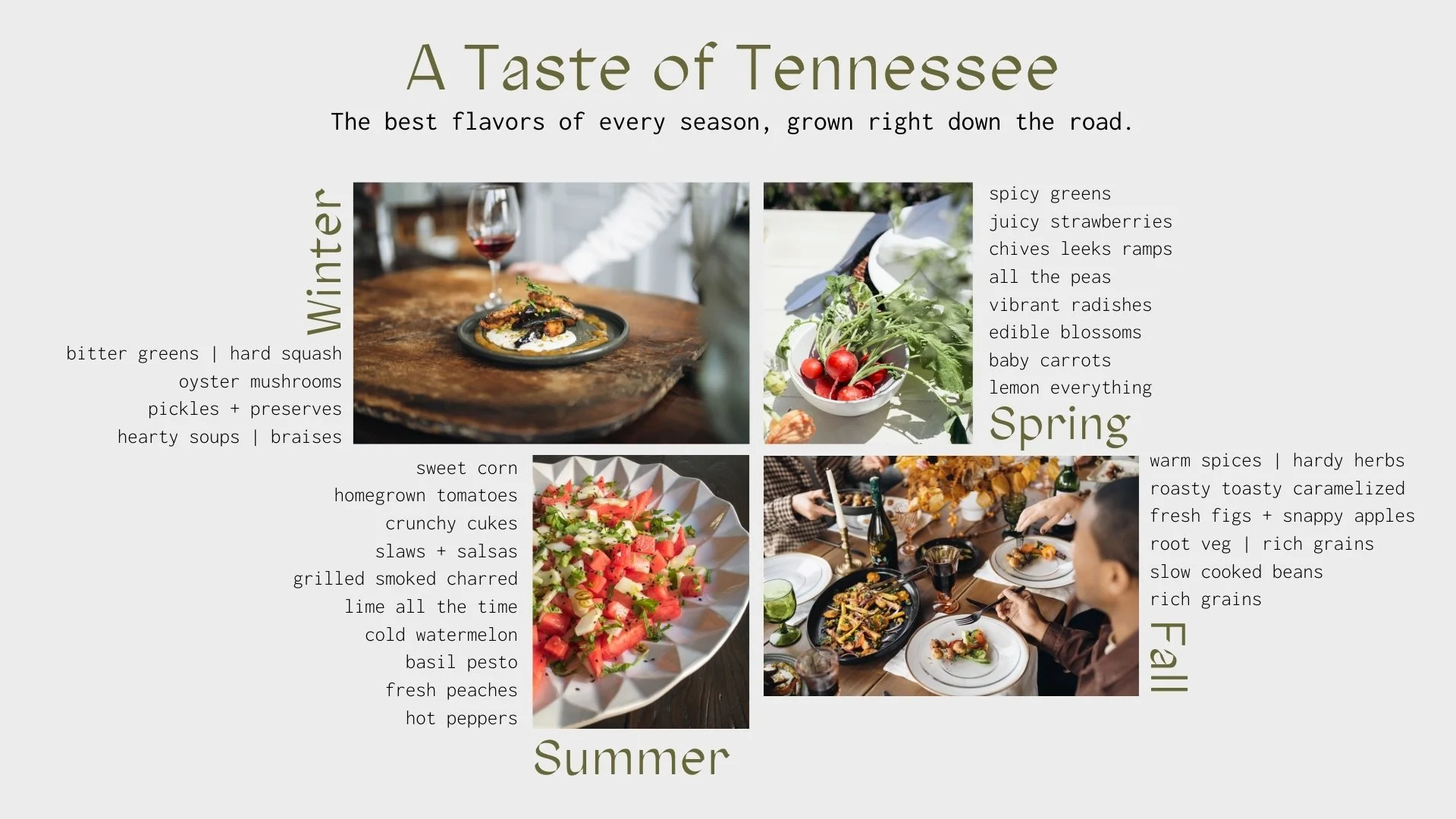 Food tells a story and it's an honor to be part of telling yours. Below we've shared some of our favorite flavors + ingredients you can expect to see each season, but we love nothing more than putting together a menu that truly reflects the couple — where they come from and who they are together.